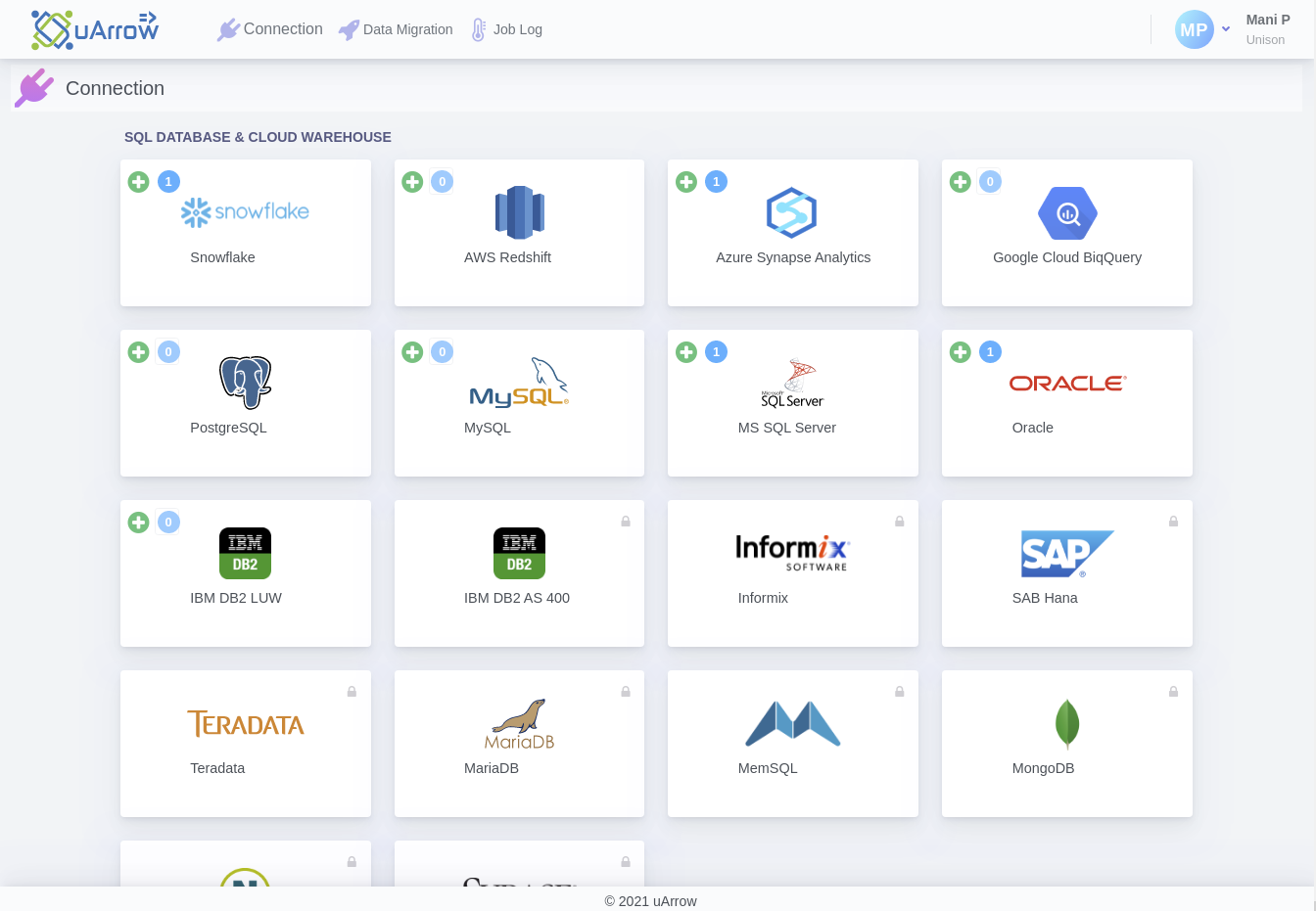 uArrow DM comes with an exhaustive list of Connection Adaptors like Oracle, SQL Server, DB2, MYSQL, Postgres, Snowflake, Redshift, AWS RDS, Big Query, Azure Synapse and many more that you would need.